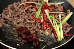 锅中再倒点油,煸炒过的牛肉丝倒回锅中。加入姜丝、葱白、干辣椒继续将牛肉煸酥。