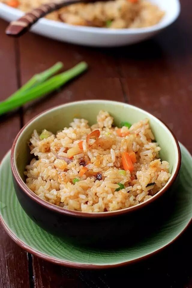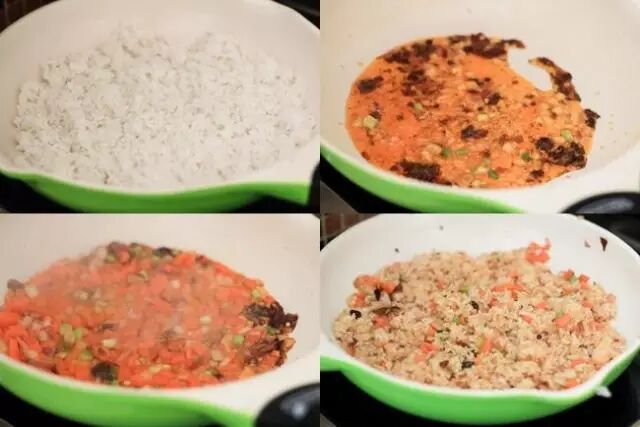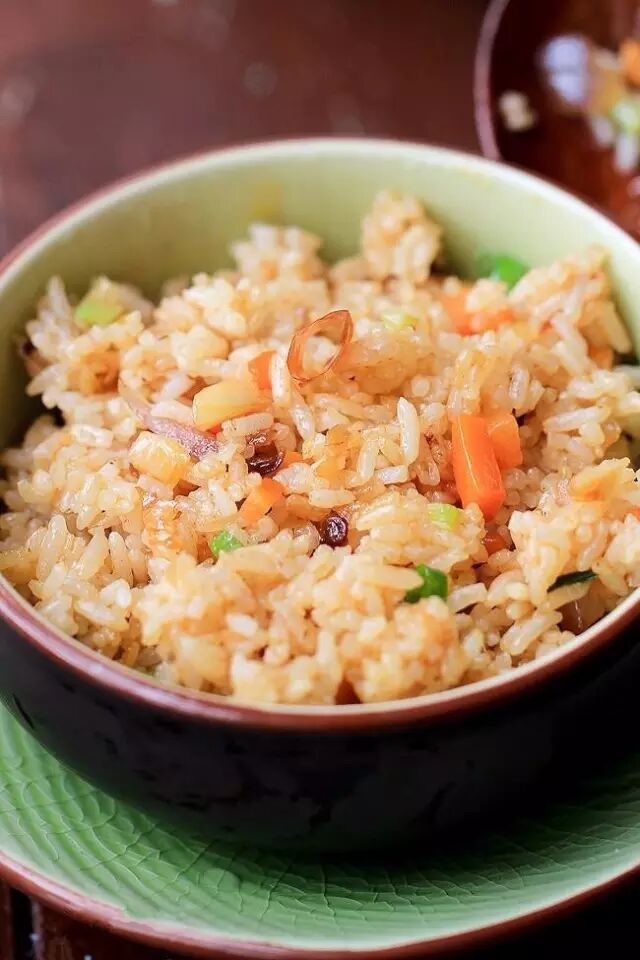 锅倒油,放米饭翻炒,把团打散,盛出。