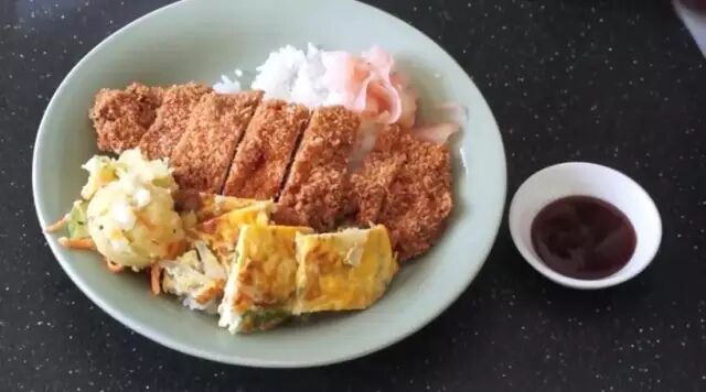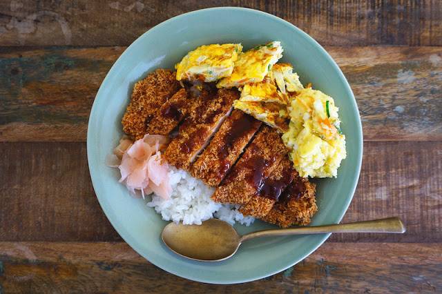 将炸好的鸡肉切成小块,摆放白米饭上,再加点配菜装饰即可。最后,倒取适量的日式猪排酱汁,夹一块金黄酥香的鸡肉蘸一蘸,真的好吃极了!