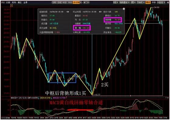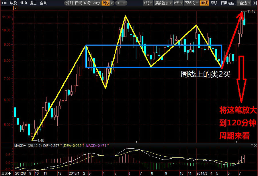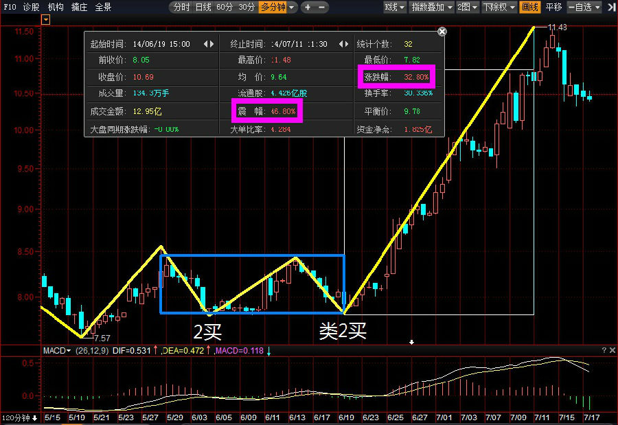 首先还是要寻找合适的周期,在周线中看,形成中枢的过程中,MACD黄白线回抽零轴合适。而且此处的中枢已经延伸到了5笔,有较大可能形成出中枢的一笔。由于周线上的周期太长,我们如果要把握这个买点可以通过次级别来看,同样通过MACD黄白线回抽零轴来参考,120分钟周期看这段上涨比较合适,在低点7.57元之后的这段上涨中形成了上涨中枢,并提供给了我们120分钟周期的2买和类2买的机会。因此操作金龙汽车我们可以结合大周期的类2买+小周期的类2买共振来操作。
