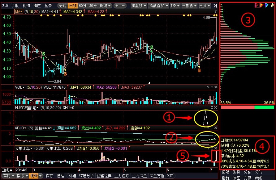 2,ABJB指标底部抬头突破压力位,同时顶部线下移,表明该股压力逐步减轻。