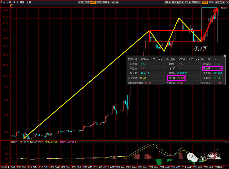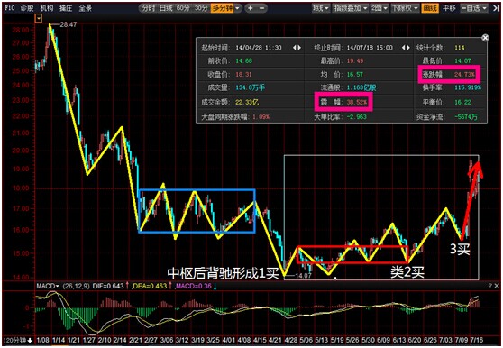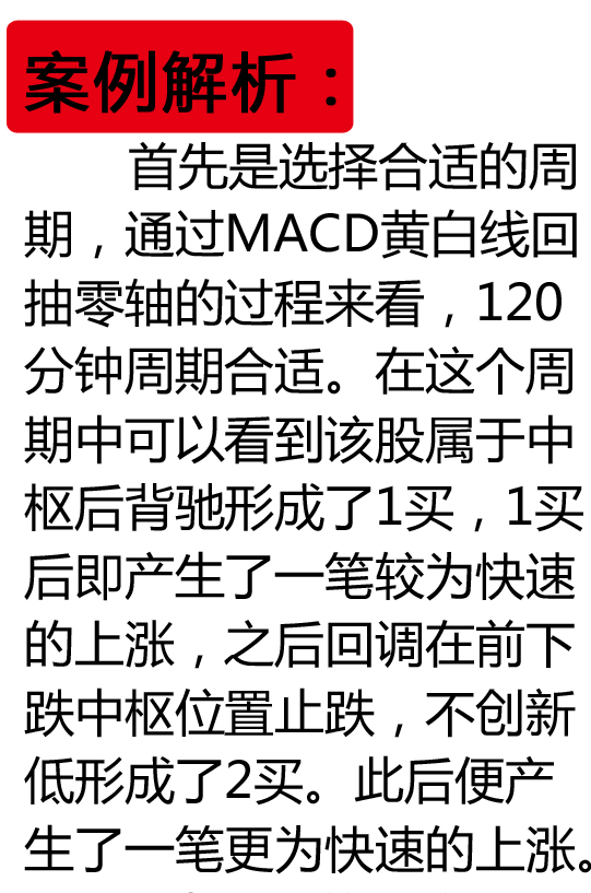 首先还是要选择合适的周期,通过MACD黄白线回抽零轴来看,120分钟周期比较合适。在前期下跌过程中,形成了一个下跌中枢,出中枢的一笔与进中枢的一笔比较明显背驰,由此形成1买。此后的上涨回调一笔不创新低形成2买,2买后搭了上涨中枢,此后出中枢的一笔上涨比较快,进入前下跌中枢范围受阻回落,回落的这笔并未碰到上涨中枢的上沿形成了3买。3买的买点后出现了涨停板。由此也印证了都老师常说的在各类买点中类2买及3买往往是较为快速的一笔。在经过这一系列的买点后,启源装备涨幅达到了24%。