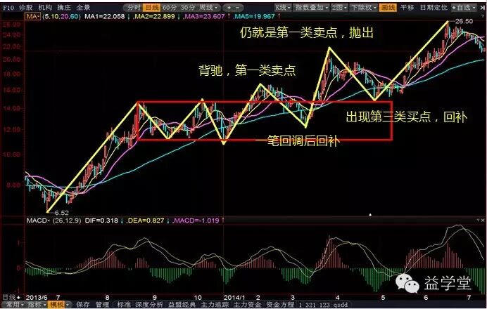 说明:同级别一中枢背驰产生的第一类卖点后,等待同级别一笔下跌后观察,若是形成第三类买点,则必须回补;若是跌回中枢,可以选择回补,因为很多一个中枢后的背驰很多时候是试图离开中枢的力量不足而被拉回,之后还是有可能继续延伸向上的。当回补回来之后,关键看是否能继续创新高,如果不能,果断扔掉。