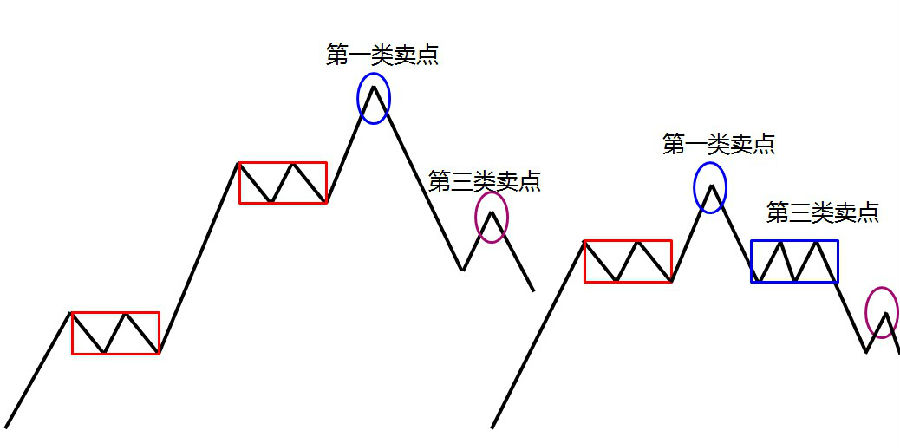 说明:第三类卖点是在针对最后一个上涨中枢回拉不进中枢的点,或者是第一个下跌中枢回拉不进中枢的点,两图中的紫色圆圈即为第三类卖点。