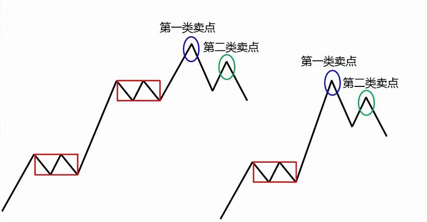 说明:第二类卖点是在第一类卖点出现后多方第一次反扑无法创出新高的点,图中绿色圆圈即代表第二类卖点。另:第一幅图中卖在第二类卖点实际上是不允许的。