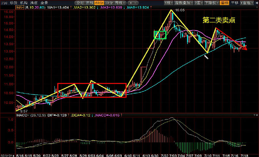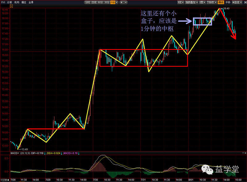 首先在60分钟周期中可以看出在第一个上涨中枢过程中形成了类2买,而类2买走成了出中枢的一笔,并进入了背驰段,下面我们就要继续关注何时出现卖点并卖出。至于如何卖出,普通的做法可以等本级别出顶分型卖出,如果要卖的更好可以将进入背驰段的这笔放大到次级别来观察,观察13.49元开始的上涨在5分钟周期比较合适(参考MACD黄白线回抽零轴),在此周期中可以看出有两个明显的上涨中枢,之后出中枢的一笔内部还能看到有个小盒子,应该是1分钟级别的中枢了,之后的背驰也就是大概率的情况了。通过这个案例我们再一次领略都老师的分型几何理论,在各个级别都能看到类似的中枢后背驰的形态,可以以此来把握住更精确的买卖点!