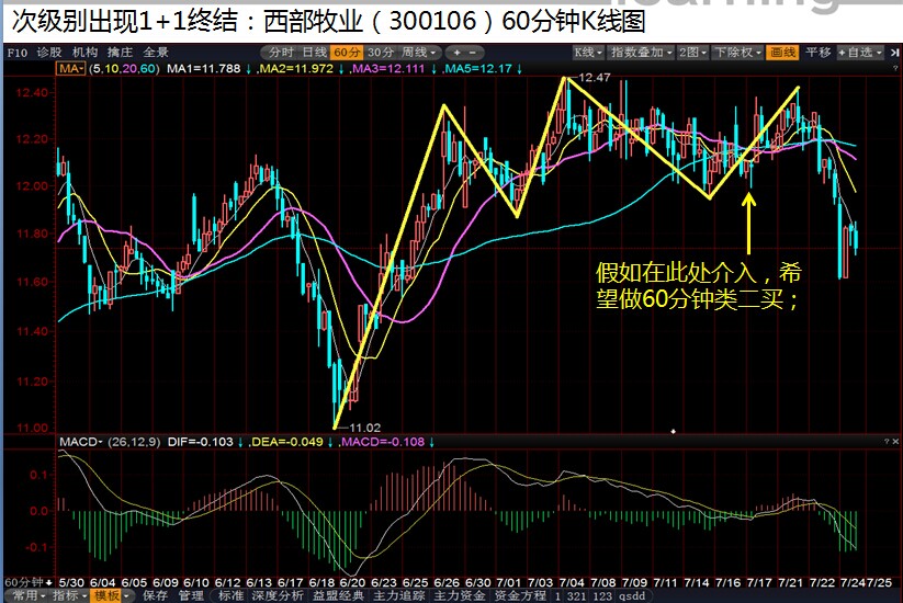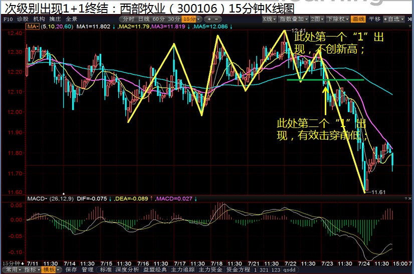 如果打算做60分钟的类2买的,按照底分型停顿买入,股价没有怎么涨,反而在次级别出现了1+1终结,不创新高,反创新低,这个时候就要注意了,系统学习过的同学就要按照我们的方法找相对高点卖出,如果未及时卖出的也要按止损位止损,等待下一个买点出现的时候回补,从而做到进退有序。