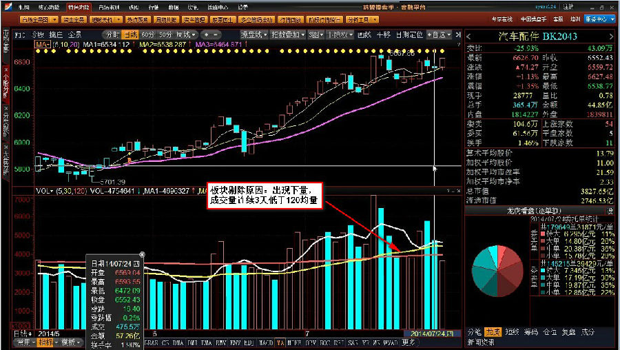 汽车配件:剔除原因是出现下量,成交量连续3天低于120的均量。