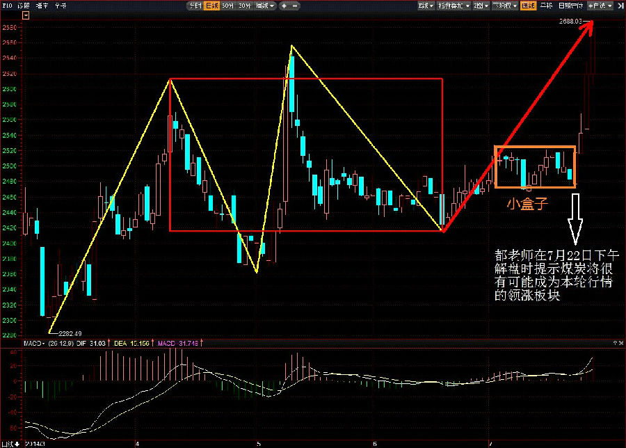 都老师之前在7月22日下午的解盘时,已经提到本次大盘的领涨板块会是煤炭及证券期货,伴随着大盘指数的节节高升,我们看到长期在底位的煤炭行业开始了一波较为罕见的涨幅,创出半年来的新高,今天我们就来看下如何通过我们学的方法来分析煤炭板块。