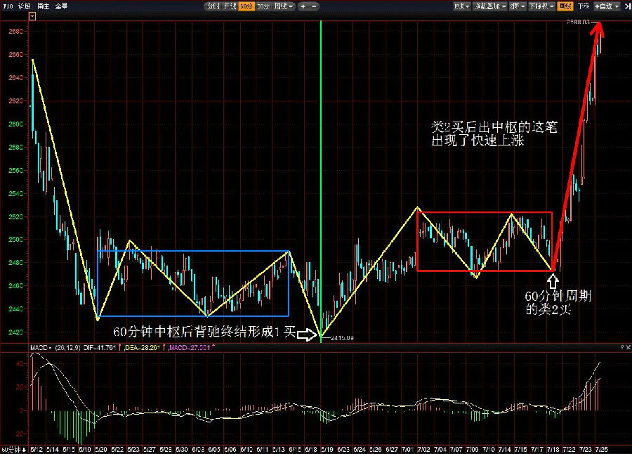 说明:如果是同级别2中枢后极少产生中枢继续延伸向上的走势,而且我们讲过大一级别80%的概率会有回调的一笔,所以操作中是等待更大级别一笔下跌结束才考虑回补。
