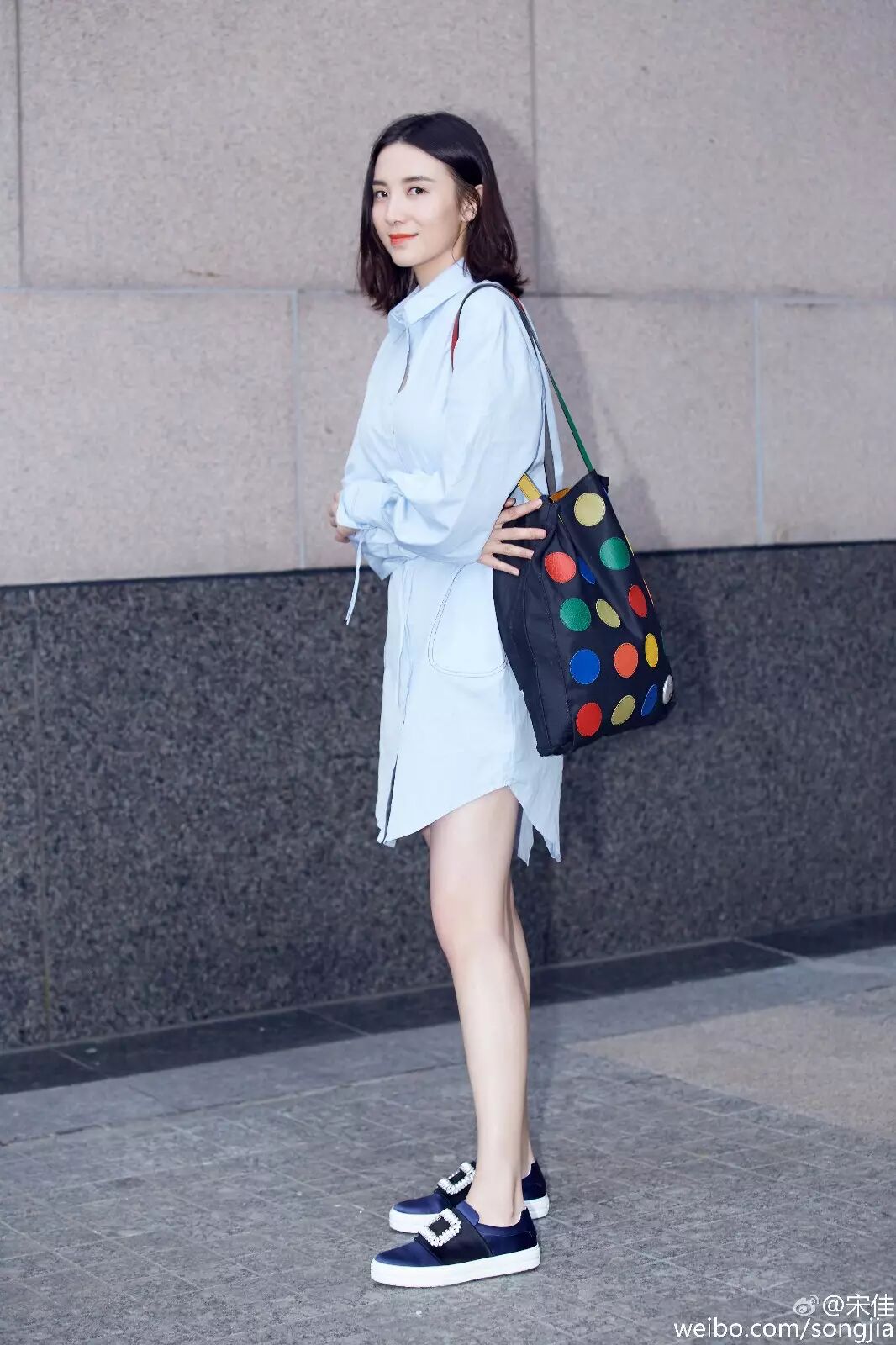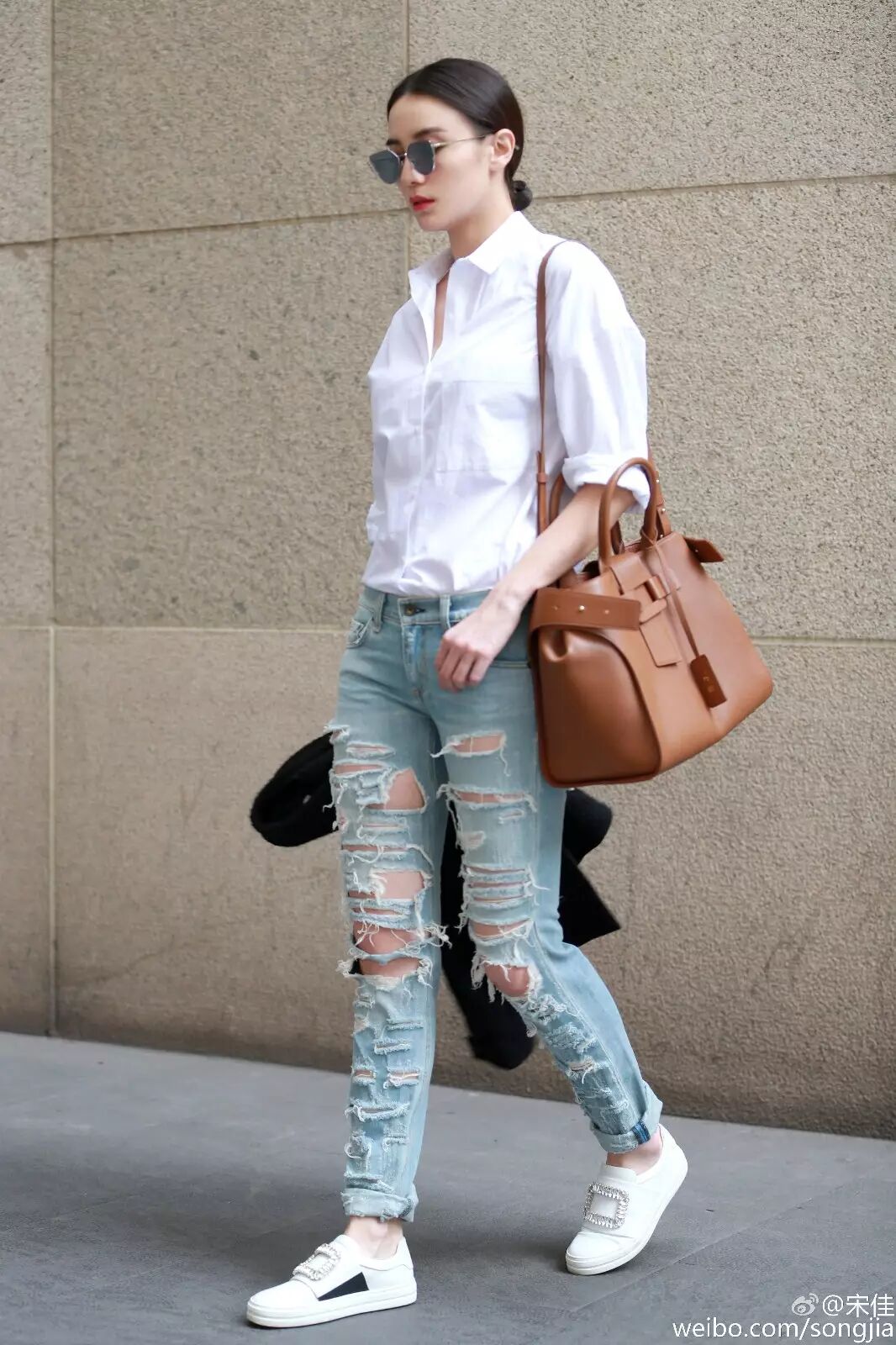 衬衫玩儿得666,出席活动个性款掉肩衬衫裙搭配平底鞋,日常款条纹衬衫搭配高腰阔腿裤,衬衫还能用作腰带╭(╯^╰)╮~私服衬衫就更简单啦,白衬衫搭配破洞牛仔裤很实用~