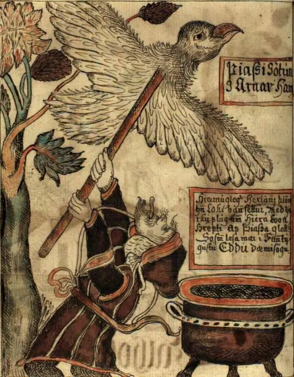 于是,被揍得鼻青脸肿的洛基担负起了找回女神&苹果的重任。洛基以其人之道还治其人之身,变成老鹰,潜入Thjazi家,抓起女神和苹果转身就跑。