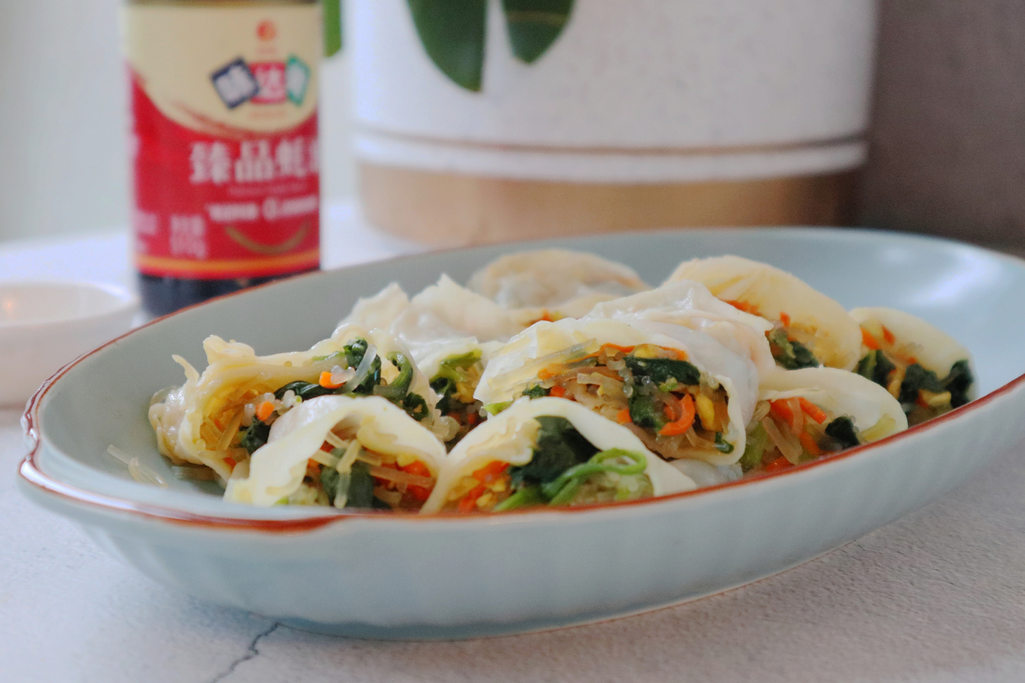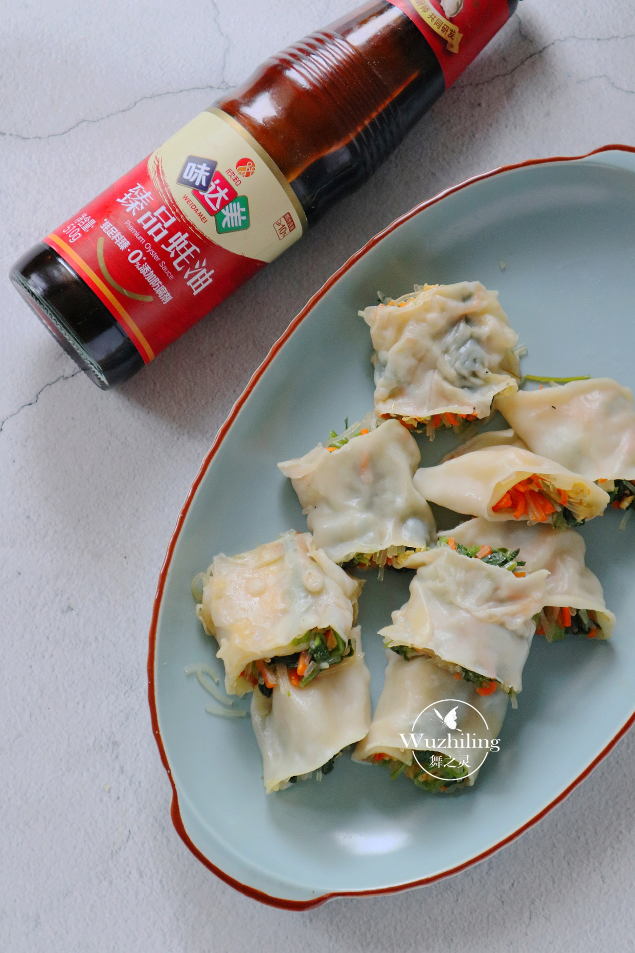 另外就是馅料材料:菠菜、鸡蛋、粉丝、胡萝卜。调料用了味达美臻品蚝油1勺,香油数滴,鸡精少许