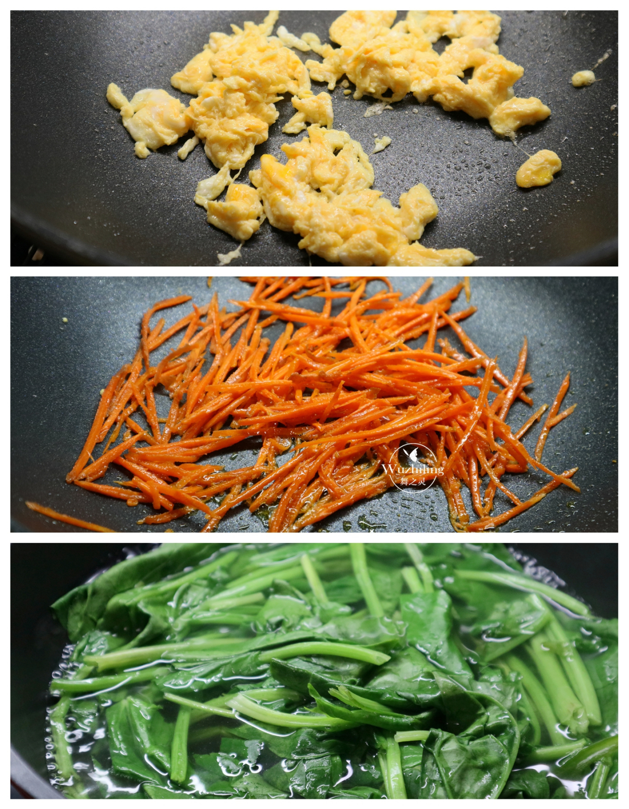 接着,锅烧热倒入油,油温5成左右放入蛋液用筷子搅拌散然后盛出来;胡萝卜也稍微炒下这样营养才更容易被我们吸收;菠菜放入烧开的水里面焯烫,记得加几滴油这样焯烫出来的菠菜色泽好看。