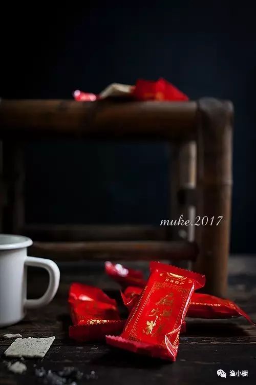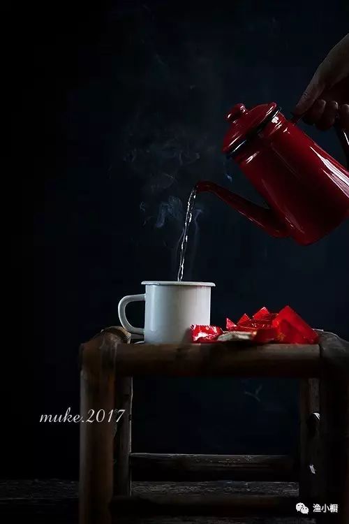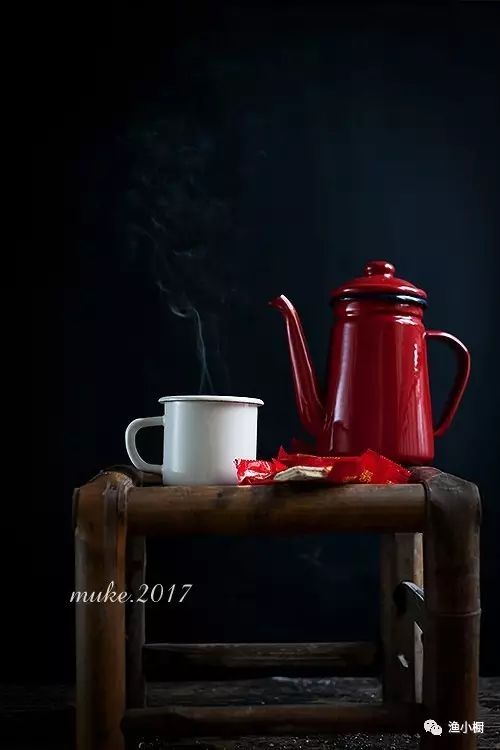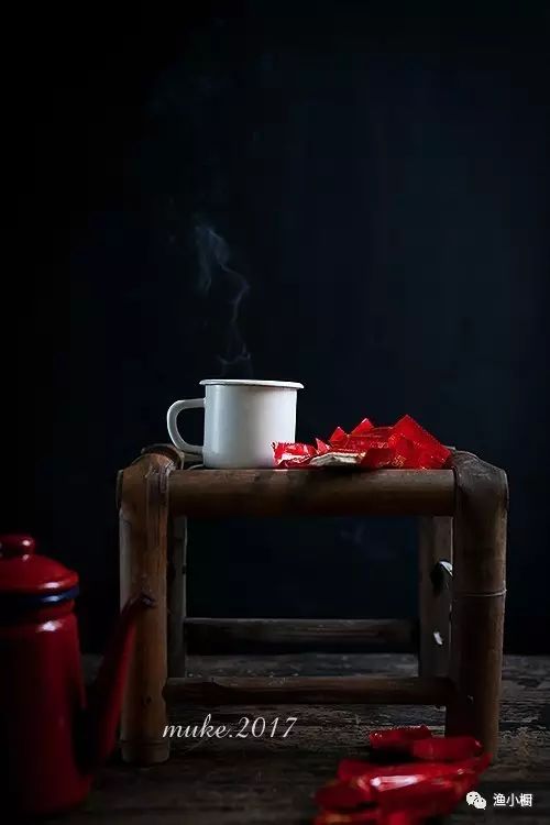 ▲小竹凳是比较中式的道具,正好家里有亲戚送的中式烘糕,红色的包装袋和竹凳很搭。还选了深红色的茶壶,而白色茶杯和升腾的热气给整个昏暗的画图增添了一些动感和层次。如果换成中式的茶壶和茶杯会更好。
