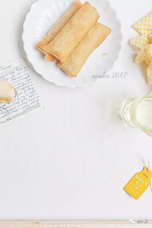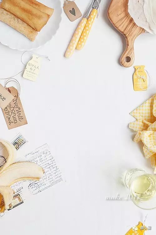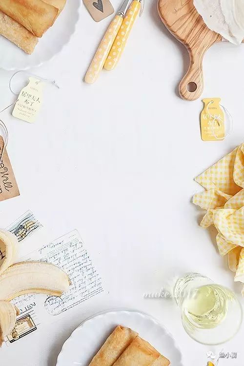 ▲美食摄影的配色:配色也是美食摄影中很重要的一课,配色通常分两种,同色和撞色。这组照片就是同色系的运用。主角是金黄色的香蕉春卷,其他辅助道具都选用了黄色系的,香蕉和油不仅和春卷同色系,也是和春卷制作相关的食材。还有木色的板,黄色的叉子,以及黄色格子的餐巾都很好的丰富了画面。