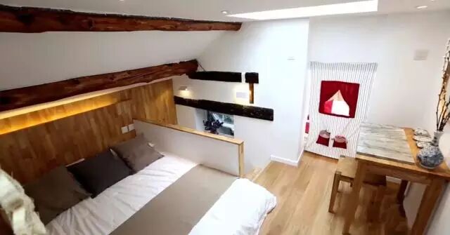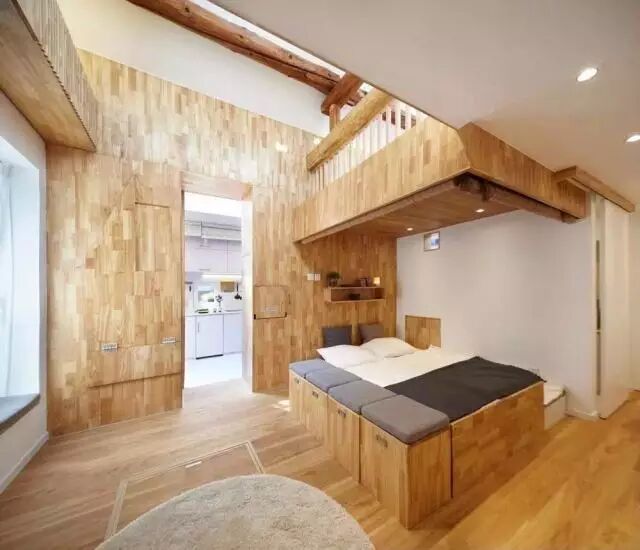 完成后的小空间,满足了业主夫妻的所有要求。上空一块升降床板,在这个狭小的空间里,创造了两张床,将来有了孩子,也不担心拥挤。