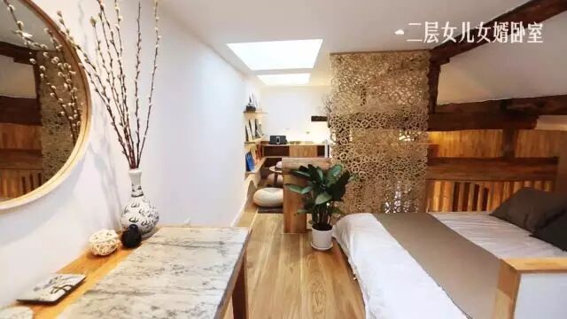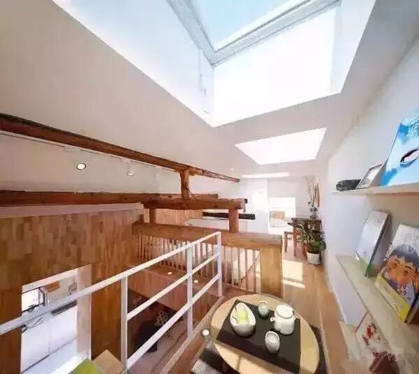 空间极小的情况下,如何利用空间才是最需解决的问题。我希望在这样的空间里,空间是可以不断变化的。原来的一层被改造成了两层。一楼,老两口卧室,连带客厅厨房卫浴更衣室厕所。二楼,女儿女婿的卧室,孙女的房间,茶室。我认为小孩子应该有相对私密的空间,而不是跟楼下的爷爷奶奶生活。我专门做了一个小的改动,开了一扇天窗,让孩子可以在这里看书,因为这个地方正好是可以看到客厅的地方,同时也可以看到后面的书房,做饭的时候也可以看到,我希望他在这个地方看书,在一个有阳光的地方学习、生活。