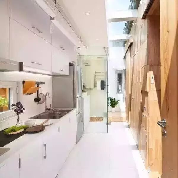 进门就是厨房。大面积的玻璃天窗,把自然光借了进来,阳光那么好,抬头就能看见院子里的老椿树。