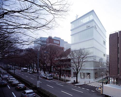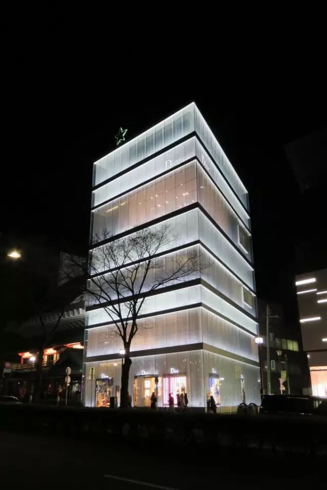 这是“豪华精品店”风格的一个典型代表,这种风格正在逐渐成为高端时尚品牌建筑的一大特征。由日本建筑事务所SANAA打造的这家克里斯汀·迪奥旗舰店坐落在东京表参道上,这是一个奢侈购物的天堂。他们的设计就是创造一间从地下室直通到四层,并且在第五层带有多用途房间的商店。SANAA决定将焦点集中在立面上,它不仅能显示室内空间,同时也赋予建筑一个富有内聚力的形象。整个立面都由玻璃板覆盖,使得整座建筑都是透明的。透明度由轻微弯曲的丙烯酸内层进行控制,看上去就像迪奥时装上流动的折痕。建筑的透明性意味着顾客和服装几乎被展示在同一个舞台上。第五层的化妆品店看起来就像一个艺术装置,灯笼杂乱无章地悬挂在天花板上,形成了一片光的森林。立面上巨大的迪奥标识进一步强化了该建筑作为品牌使者的理念。
