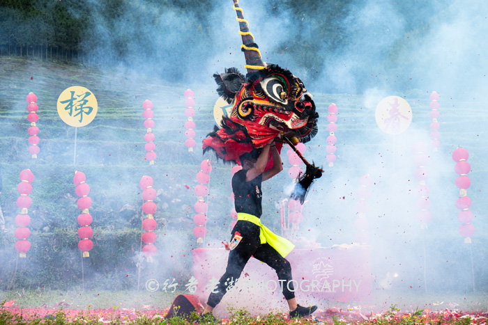 与五年前的春耕节相比,这次祈福活动更有仪式感,除了壮族瑶族的少数民族舞蹈,还有个特别的表演 — “炸火狮”。年轻力壮的小伙子戴着狮子头舞动着,四周全是点燃的鞭炮,在火光四溅中,独角的狮子在四处游走,象征着驱赶年兽驱邪, “炸火狮”是世界唯一的壮族民间文化遗产。