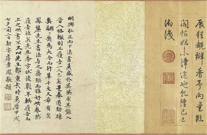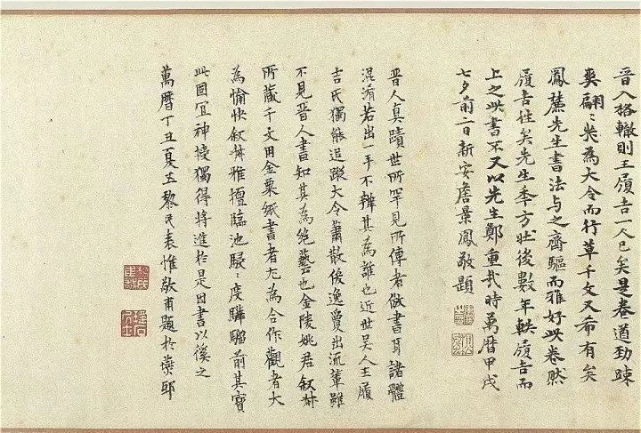 詹景凤:明兴弘正而下。法书莫盛于吴。然求其能入晋人格辙。则王履吉一人已矣。是卷遒劲疏爽。翩翩几为大令。而行草千文又希有矣。凤麓先生书法与之齐驱。而雅好此卷。然履吉往矣。先生年方壮。后数年轶履吉而上之。此书不又以先生郑重哉。时万历甲戌七夕前二日。新安詹景凤敬题。