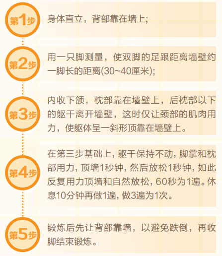 除此之外还可以进行一些有氧运动,不过运动锻炼也要适度,锻炼的基本要求是:脊柱或关节没有变形时和活动中不出现明显的症状时可积极锻炼,锻炼量应从小到大,从短到长,逐渐增量。锻炼的方法可以选择游泳、散步、跳舞、爬山等。如果没有条件进行长时间的户外锻炼,也可以考虑在空闲的时间里做一些颈椎锻炼操,步骤如下: