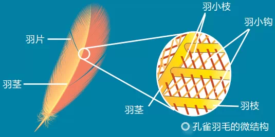 孔雀开屏时,鲜艳的羽毛不禁让人感叹这个物种的美丽与高贵。如果你认为孔雀羽毛上的色彩和一般纺织品、印刷品上的色彩是一样的,那就大错特错了。我们平时看到的不同物体呈现不同的颜色,其原理大多都是“颜料生色”,是靠介质表面的反射被动发光,所呈现的颜色是光源的色环中某些相应的颜色被颜料吸收后所剩余部分形成的,即减色法原理。而孔雀羽毛呈现缤纷的色彩源于“结构生色”。孔雀羽毛的羽小枝内排列着一层层蛋白纤维,这种极细的蛋白纤维直径大小为150~160纳米,这些纤维按照一定的周期性规律排列。正是这种纳米级的微观物理结构,当受到光束照射时,会对光波形成良好的干涉和叠加,在不同的方向上反射出不同的颜色的光,不同的结构也会使得反射光的颜色不一,这就使得本来无色的羽毛在光照下呈现出斑斓多姿的色彩。
