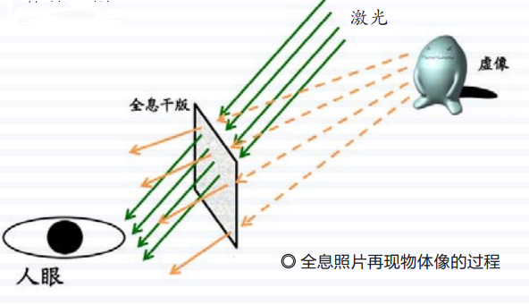 再现物体像的时候,需要用一束激光照射到全息照片上。当这束激光的波长和传播方向与参考光束完全一样时,就还原了物体原来的光场。我们从不同角度观看,可以观看到物体的不同侧面,就跟看到真实的物体一样。全息摄影的记录材质也与普通摄影不同。传统光学全息采用卤化银、重铬酸盐明胶和光致抗蚀剂全息摄影的记录材质也与普通摄影不同。传统光学全息采用卤化银、重铬酸盐明胶和光致抗蚀剂等制成感光胶片来记录全息图,全息图需要经过后续的显影、定影、漂洗、烘干等处理,显得烦琐而费时。近些年来,出现了光导热塑料、光致聚合物、光折变晶体等新型光敏材料,不仅能省去繁琐的化学处理,而且存储信息的容量和衍射效率得以提高。