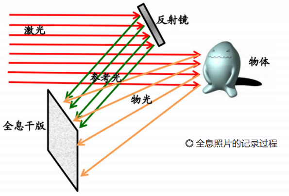 普通摄影术基于透镜成像原理,在自然环境下即能拍摄成像。而全息摄影术需要利用特殊的光源(一般采用激光),记录物体发出的散射光。记录的时候将激光束分为两束,一束直接投射到记录介质上,称为参考光束;另一束光束投射到目标物体上,经过物体表面的散射作用形成物光束。让物光束投射在记录介质的同一区域上,它与参考光束在记录介质上产生干涉叠加,形成干涉条纹,再经过处理之后,就得到一张全息照片。
