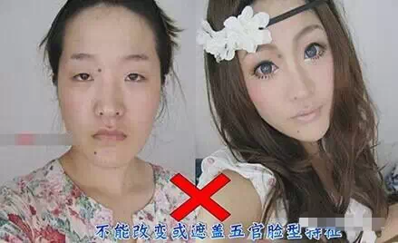 换句话说,化妆的前提,是这个妆不能改变或遮盖五官脸型特征,像那种化过妆后瞬间从恐龙变女神的技术是不行的。