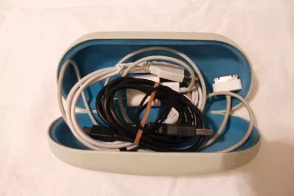2. 把各种电源线缠好放到旧眼镜盒里。
