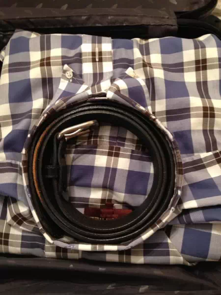 8. 把腰带卷好放到衬衫的领子里。