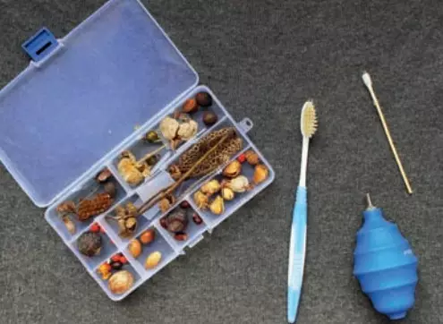 收集的自然物带回家后,一定要做的一件事就是清洁和规整。选用的工具可以是废旧牙刷、酒精棉签、气吹等等,有些树叶或不宜清理的,吹去浮尘即可。