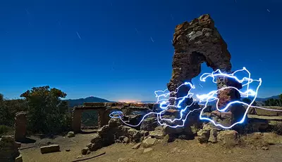 把相机放在三脚架上,或者放在一个稳定的平面上,就可以开始拍摄了。一般拍摄光绘需要两个人合作,摄影师负责按下快门,另外一个人在镜头前用光源画出各种图案。一开始不熟练可能画不好,最好提前想好了要画什么,怎么画,确定一个活动的区域。还有就是,如果你不太会后期处理照片,最好在一开始就把字反着写,这样拍下来的就是正常的字和图案啦。