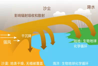 沙尘漂洋过海时,部分随大气沉降进入海洋,为海洋生物提供营养物质。其中的氮和磷可明显促进海洋初级生产力,高强度的输入则可能导致浮游植物的暴发性增长。此外,全球海洋面积中,约20%是高营养低叶绿素海区。在这些海区中,铁元素是浮游植物光合作用的主要限制因子。含有大量铁元素的沙尘气溶胶沉降入海,促进了海洋的初级生产力。被称为沙尘的“铁肥效应”。地球上50%以上的光合作用是由海洋的浮游植物进行的。浮游植物的增加,除了为其他海洋生物提供更多的食物来源,同时也固定了更多的碳,进而使大气中二氧化碳浓度降低,减少大气中温室气体含量,以减轻全球变暖效应。