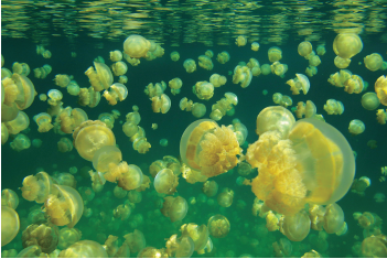 在西太平洋上的帕劳群岛中,有一个十分有名的水母湖。数万年前水母湖曾是海的一部分,由于地壳运动周围的海床升高,逐渐将它与外海隔绝,形成了一个看似普通的内陆咸水湖。湖中大多数海洋生物都随着养分的消耗而消亡,只剩下了一种低等的、靠少量微生物就可以生存的水母。由于没有天敌捕杀它们,这些水母逐渐失去防卫用的毒素,令游客可以放心地和它们共游。 无毒水母为食草性,主要是靠海藻分泌的营养素维生,体色呈现黄色。在接近中午的时候,密密麻麻的黄色水母会浮到水面上晒太阳,令整片湖面出现金色的波纹,反射出金色的光芒,耀眼又壮观。因此,水母湖又被称为金光湖。