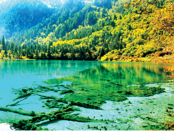 在四川九寨沟景区有个五花海,又称五彩湖,其中水色变幻多端。水面上有的地方显露出海蓝色,有的地方呈现着翠绿色,有的地方辉映成橙黄色。 阳光透过林梢撒向湖面,湖水明澈如镜,倒映出林梢的绚丽色彩;湖底的石灰岩,层次高低不同,有深有浅,本身颜色有别;加之多年沉积的古树叶、有色矿物质和各种不同颜色的藻类的染色作用,在阳光照耀下,便犹如一幅五彩缤纷的画卷。