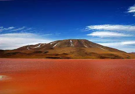 在玻利维亚西南部海拔4278米的高原地带,有一片红白相间的浅滩咸水湖,被当地人称为有颜色的湖,又称红湖。从远处往湖望去,会看到湖水出现大片红色。当然也并非全红,还是有部分湖水呈现蓝色。红湖的红色是由于一些红色的沉积物和藻类在湖中的映衬,再加上由于湖水中富含钠、镁、硼砂和石膏等物质,一些浮游生物得到了很好的生长,所以使得整个湖水被染上了淡淡的红色。