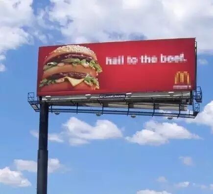 在远处立红、蓝两块广告牌,你判断一下谁远谁近,八成你觉得红色的那块离你更近。不好意思,你怎么能一再被忽悠呢!它们其实在同一个地方。色彩有前进色和后退色之分,红色等前进色给人向前凸起的感觉,蓝色等后退色给人向后凹进的感觉。广告牌采用红色和橙色等前进色,不仅醒目,而且有凸出的效果,很远就能看到。下次拿这个去忽悠你的同学吧!