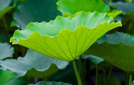 第一片莲叶要第一时间破水而出,所以它在水下像锥子一样卷起,这是阻力最小的状态,因此才有“小荷才露尖尖角,早有蜻蜓立上头”的景致。等它刚刚露出水面,卷着的叶片就迅速展开。这主要是因为莲子的养分不足以支撑莲叶继续向上生长,所以莲叶必须快速打开并进行光合作用,以制造养分来维持生命。这片叶子在水面上漂浮,被形象地称为浮叶。