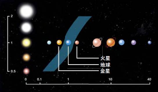 恒星系统的宜居带。纵坐标为中心恒星质量的大小(以太阳的质量为1),横坐标为行星与中心恒星的距离(以地球与太阳的距离为1)