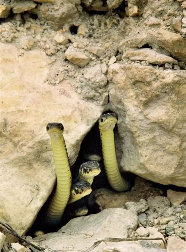 蛇类会钻入深深的岩缝或其他能在严寒的冬季维持相对稳定的温度的地下洞穴中,常常会成百上千条聚集在同一个洞穴里以便更好的保存热量;