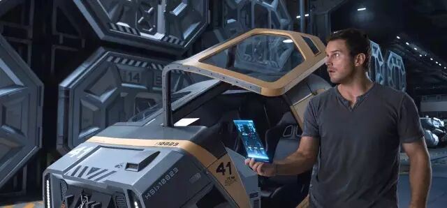 (“阿瓦隆”号体积庞大,吉姆走远路只能乘坐交通车,并通过手中的便携智能设备了解这艘飞船,《太空旅客》电影截图)
