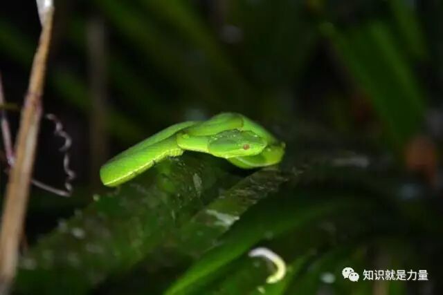 (竹叶青翠绿的体色与背景完美融合,周围的猎物很难发现它的存在)