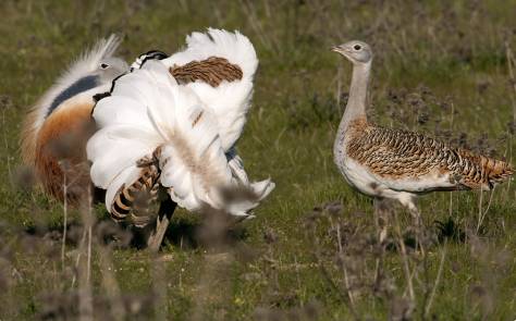 大鸨每年4月中旬开始繁殖,雄鸟的求偶炫耀很特殊。首先双腿微屈,伸直颈部,嘴水平向前,使身体与地面保持平行,然后尾羽向上抬起,并有向背部折叠的趋势,从而露出白色的尾下覆羽,开始它的求偶舞蹈。一般,雄鸟露出的白色羽毛越多、越白,就越受雌鸟的青睐,在争夺配偶的竞争中也就越占有优势。