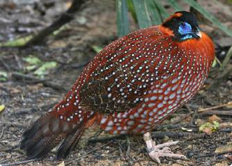 在鸟类中,鸡形目雌雄的体色差别是最大的,雉鸡是其中最典型的代表。通常,雄鸟颜色鲜艳,光彩夺目,雌鸟则体色灰暗。多种角雉在繁殖的发情期,雄鸟会长出特有的雉鸡角和裙边。例如,国家二级重点保护野生动物红腹角雉,雄鸟体色深红色,夹有许多小白点,脸蓝色;雌鸟通体暗灰色,兼有白点。进入繁殖期后,雄鸟的头部长出一对肉质的角,脸部及前胸膨大出一个蓝色夹有白点、红斑的肉裙,鲜艳的色彩和结构对雌鸟是极大的吸引。此外,红腹角雉还有求偶的追逐行为,雄鸟张着嘴,不停地抖动着蓝色裙边,闪动着翅膀,前胸抬起追逐雌鸟,直到雌鸟接受,完成交配。