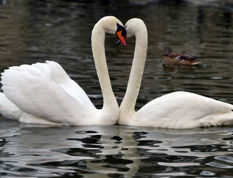 天鹅是一种稀有的“终身伴侣制”鸟类,被视为忠贞的象征。不论是取食或休息,天鹅都保持成双成对的状态。雄天鹅在雌天鹅产卵时,会在旁边守卫;遇到敌害时,它会拍打翅膀上前迎敌,勇敢地与对方搏斗。如果一只天鹅死亡,另一只也会为之“守节”,终生单独生活。天鹅的求偶行为丰富,包括以喙相碰或以头相靠,雌雄会趋于一致地做出相同的动作,还会体贴地相互梳理羽毛。