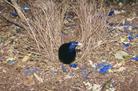 园丁鸟科分布在澳大利亚和新几内亚,有8属20种,园丁鸟科的鸟类毛色光亮,雌雄异色。在一雄多雌的园丁鸟中,雄性园丁鸟为了赢得配偶,在求偶期会投雌鸟所好,用树枝筑拱门或亭子,建成求偶亭。建好后,雄鸟会用嘴叼来各种色彩斑斓的小物品,如美丽的羽毛、石子、植物果实、蜗牛壳、可以吃的浆果甚至瓶盖来装饰求偶亭,作为“礼物”献给雌鸟,以此博得雌鸟的喜爱。礼物越多、越奇特,越能赢得雌鸟。雌鸟在欣赏求偶亭时,就可以判断雄性园丁鸟的能力,进而决定是否接纳雄鸟。