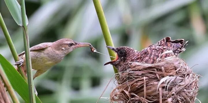 大杜鹃的卵在大小、颜色和斑纹上都尽量模拟宿主的蛋,但通常都偏大。画眉、家燕、伯劳或苇莺等宿主鸟类,对自己和杜鹃的卵通常缺乏辨识能力。在宿主的精心孵化下,由于大杜鹃的卵孵化期较短,雏鸟往往比宿主的雏鸟先出壳,出壳后的杜鹃雏鸟会将宿主的卵或雏鸟推出巢外,自己独享宿主的喂养。 尚不知情的宿主出于本能辛勤地哺育杜鹃雏鸟,直到杜鹃雏鸟离巢。